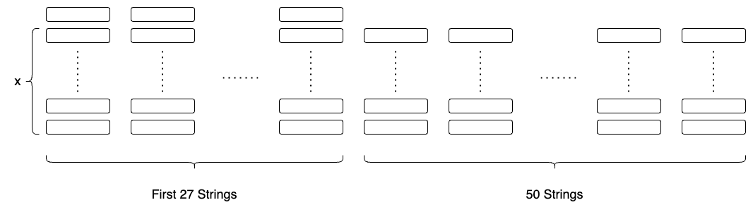If we define $x$ as the number of coins in one string if we make $77$ strings. The equation will be $77x - 50 = 78y$. This way, we consider filling up as many strings as possible first.